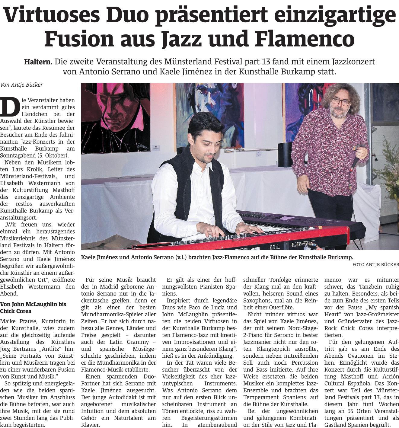Im Rahmen des Münsterland Festivals gastierten der Madrider Mundharmonika-Antonio Serrano und der junge Pianist Kaele Jiménez in der Kunsthalle Burkamp. Das Konzert, gefördert von der KulturStiftung Masthoff und Acción Cultural Española, stand ganz im Zeichen des Flamenco Jazz – einer Stilfusion, die beide Künstler mit hörbarer Leidenschaft und technischer Raffinesse verkörperten.